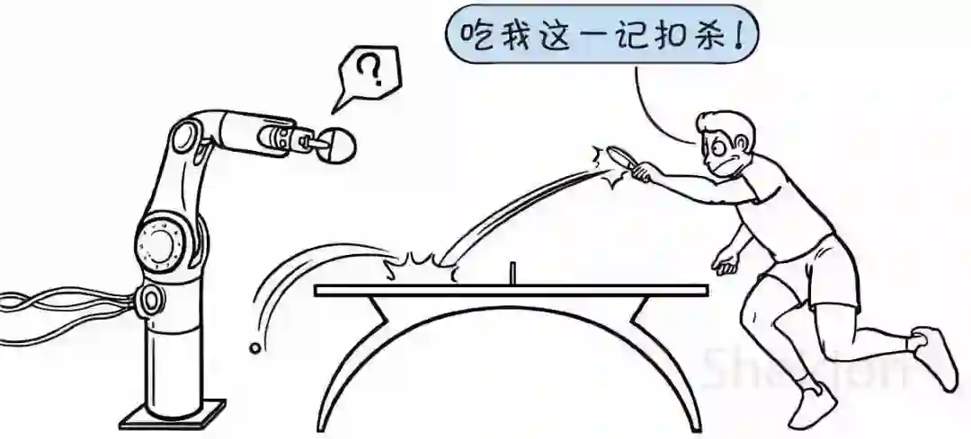 比方说,你想教计算机控制一只机械臂打乒乓球。一开始,计算机控制机械臂像傻瓜一样,拿着球拍做很多随机的动作,完全不得要领。