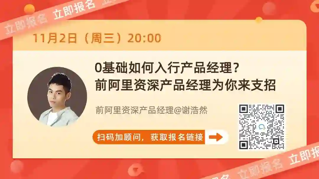 11月2日(周三)晚上8点!特邀前阿里资深产品经理@谢浩然老师在线直播,用1小时带你解读职业取向/价值/空间三大关键问题,帮你明晰产品职业发展路线!
