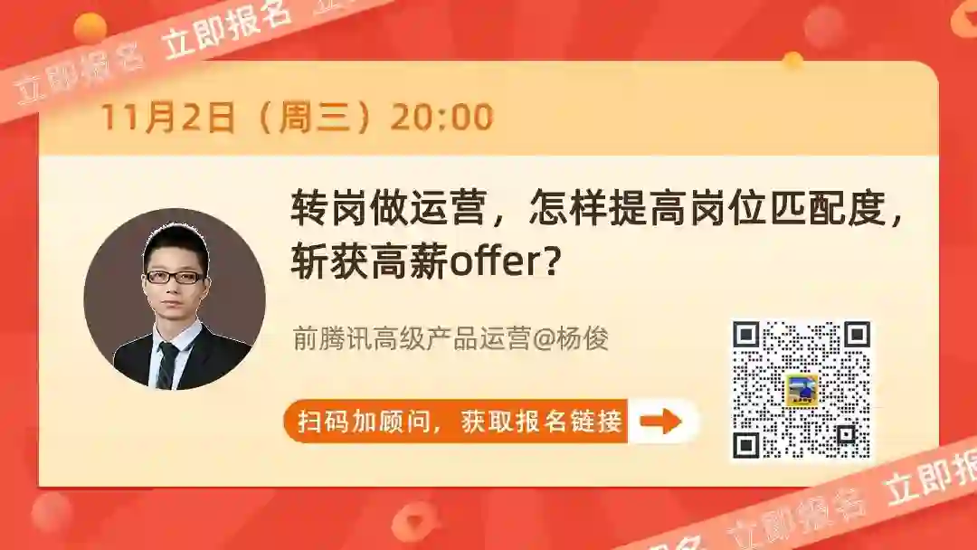 别担心!11月2日(周三)晚,深耕互联网运营16年之久的杨俊老师将会直播,传授给你一份『转岗指南』: