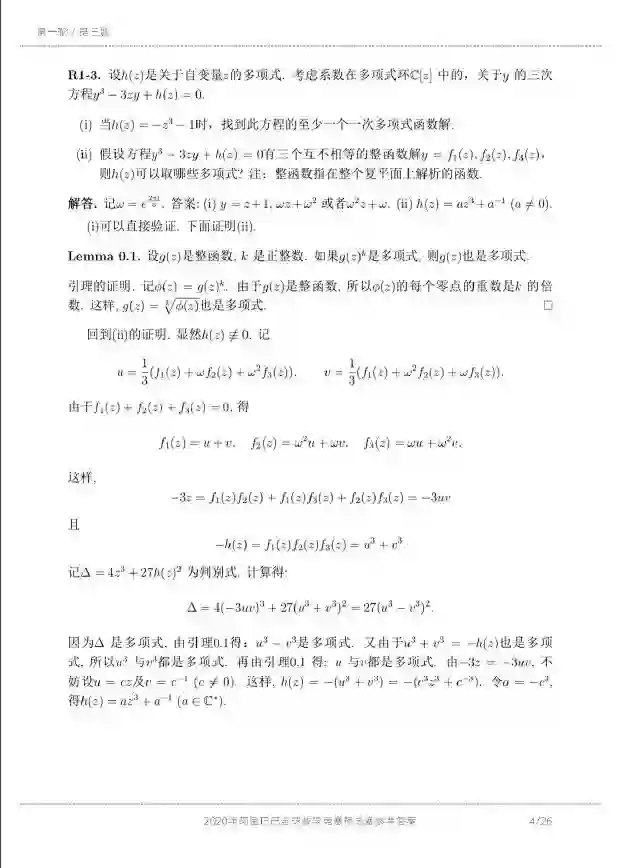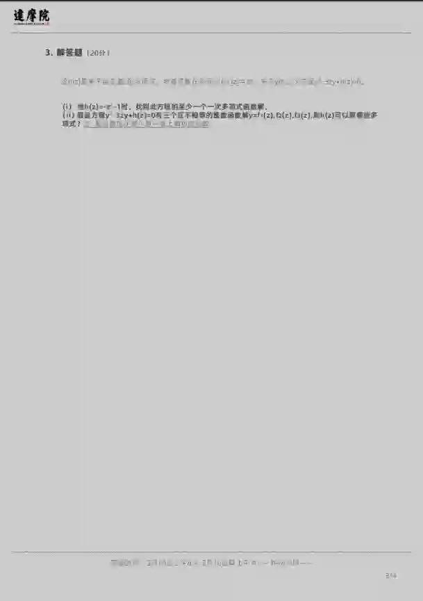 ,需要完成找到方程的一个一次多项式函数解,同时在假设方程有三个互不相等的整数函数解情况下可取的多项式。