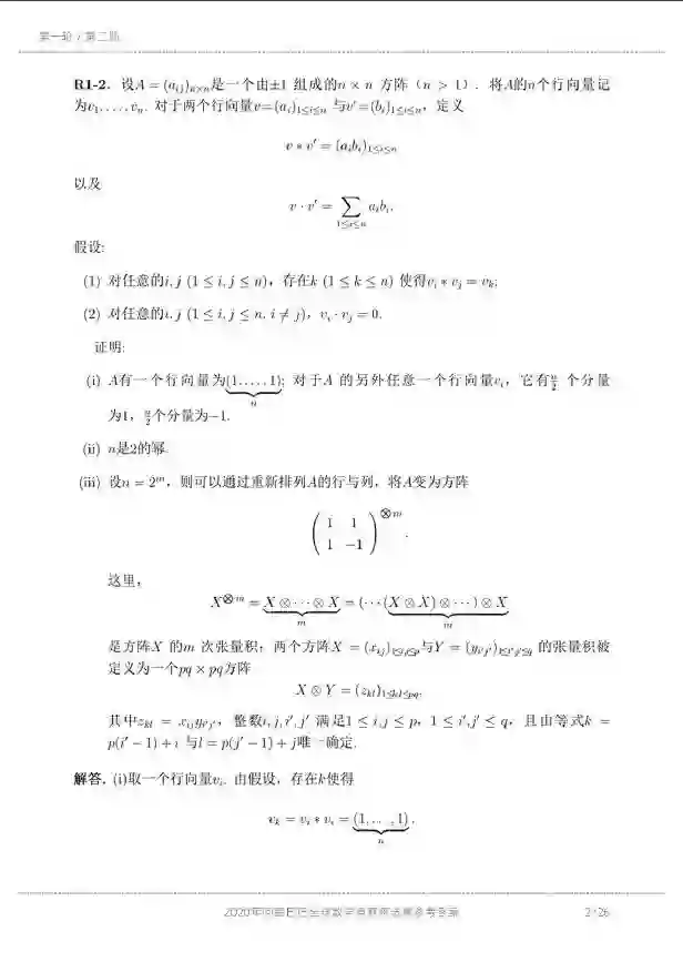 题目中给出了 n 阶方阵,并从里面抽取出 n 个行向量,题目定义了两种运算,一种是常见的对应元素乘积(Hadamard product),另一种疑似是向量积(前提的第二个行向量需要转置)。