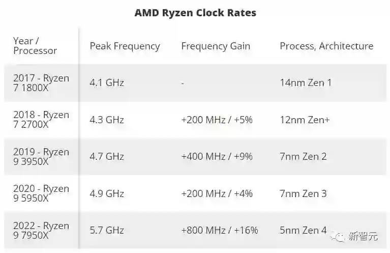 可以看到,与往代Ryzen系列旗舰相比,7950X在频率上有了明显的提升。这也是AMD过去几年来的产品趋势。