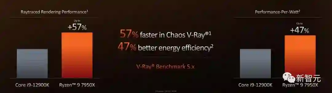 在多线程应用(如Chaos V-Ray)上,7950X与12900K对比,最高性能优势可达57%,能效优势(每瓦特性能)也高达47%。