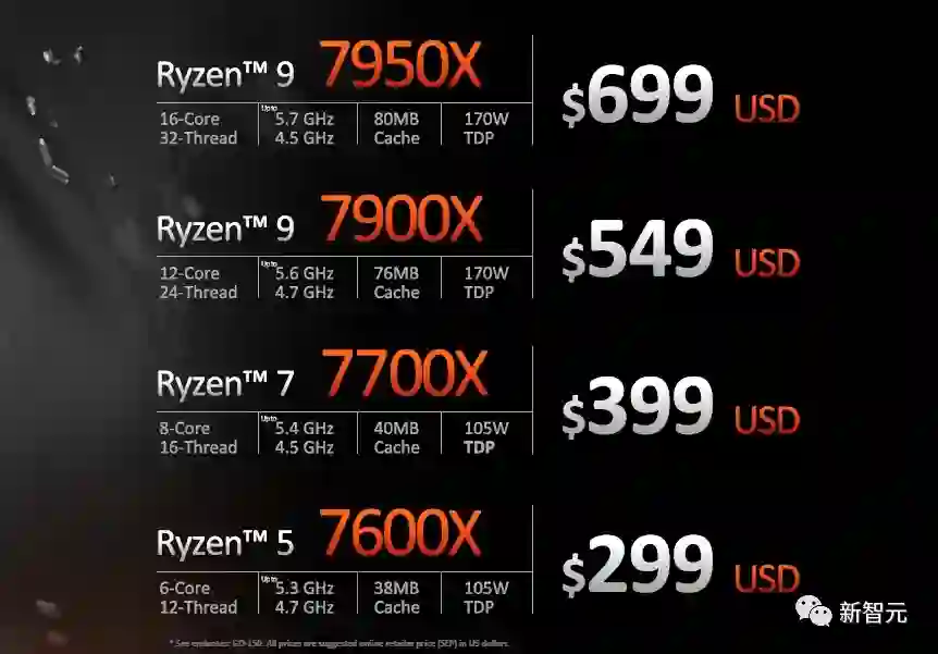 中端方面,8核16线程的7700X比5700X贵了100美元,入门级的7600X定价维持在了299美元,与5600X的首发价一样。TDP也上升至了105W,达到了上代大哥5950X一样的水平。