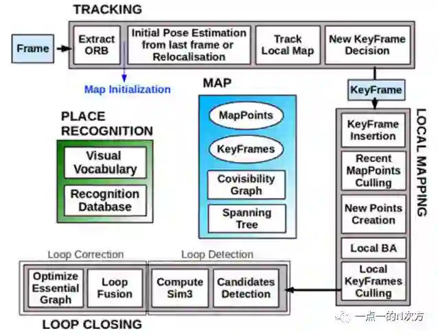 ORB-SLAM主要由三个并发进程组成:跟踪、局部建图和回环检测,下图是论文中给出的系统框图,很直观地展现了各模块的功能和步骤。