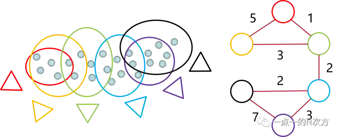 于是就可以得到右边的图结构,红黄之间边的权重为5,红绿权重为1,黄绿权重为3等等。