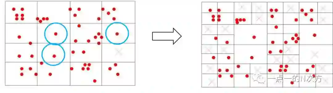 这时3行4列那个节点中没有特征点了,那么就将该节点删除。同时,画蓝圈的三个节点内只剩1个特征点,那么这些节点也不会继续划分下去了。