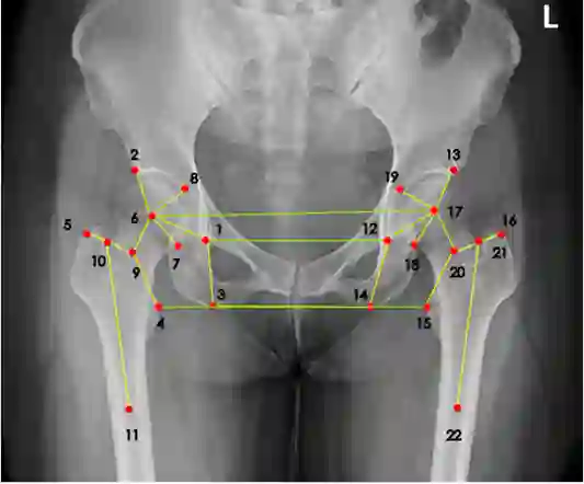 那么有没有可能通过某些自动化方法或者软件来完成准确而且标准的髋关节置换规划?答案是可行的。2018年左右,来自约翰霍普金斯大学的学者曾经提出通过两阶段卷积神经网络结构(CNN)来检测X射线成像图谱的手术测量标志点,并且能够从任意角度来完成成像检测。同时,也有有其他的一些研究试图引入人体解刨学特点,通过找到原本手术测量标志点之间的关系自动标注。但是在实践环节中,这些方法的准确率相较传统方案,并没有提升太多。