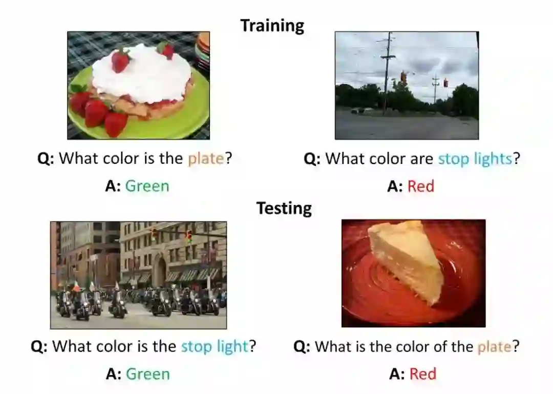 图 4. 组合性 VQA 数据集(C-VQA)的示例。测试集中词语的组合是模型在训练集中没有学习过的,虽然这些组合中的每一单个词在训练集中都出现过。图片来源于 Agrawal et al. 2017。