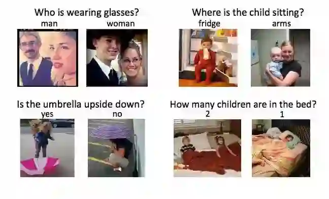 图 2. VQA 2.0 数据集中的图片及问题示例,每个问题对应着两个相似、但却需要不同回答的图片。图片来自论文 Goyal et al. CVPR 2017。