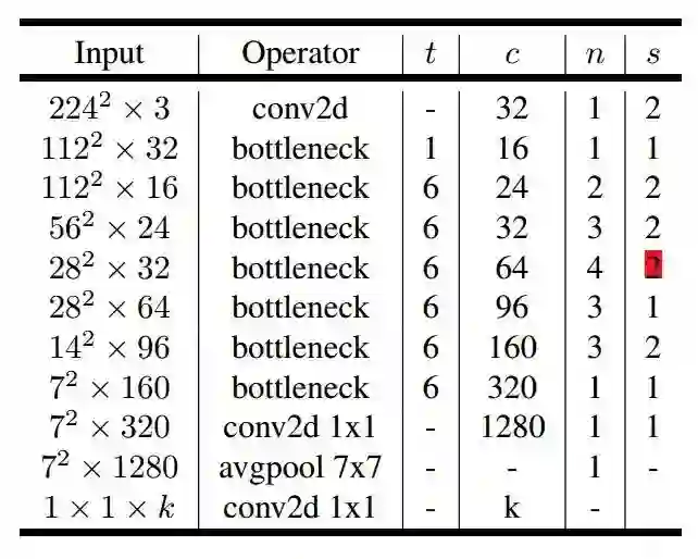MobileNetV2 的网络结构中,第 6 行 stride=2,会导致下面通道分辨率变成14x14,从表格看,这个一处应该有误。