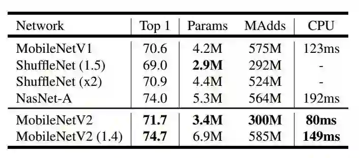表 3 在 ImageNet 数据集对比了 MobileNetV1、ShuffleNet,MobileNetV2 三个模型的 Top1 精度,Params 和 CPU(Google Pixel 1 phone)执行时间。MobileNetV2 运行时间 149ms,参数 6.9M,Top1 精度 74.7。