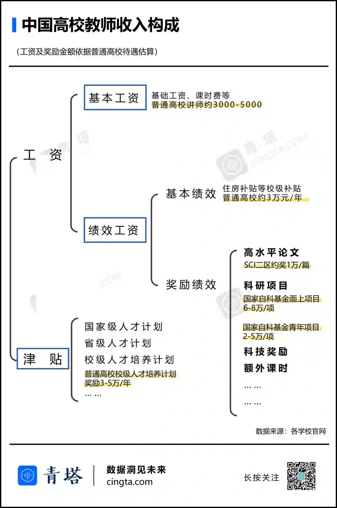 据青塔的一项调研,在我国,高校教师的工资构成大概是这样