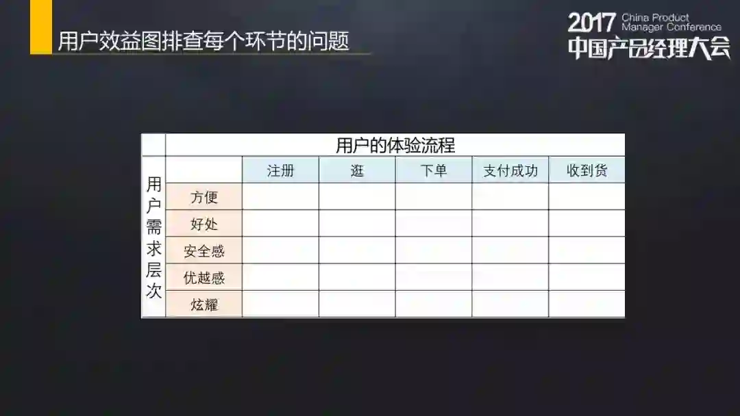 用这样的二维表,你会把问题分到25个格子里,再在每一个格子里找可以突破的或者没有做好的,比如说注册流程够不够方便,有没有好处(没有的话就做新手礼包)?有没有安全感?会不会遇到侵犯隐私的点?有没有优越感?用什么渠道注册?VIP通道还是被邀请?等等。