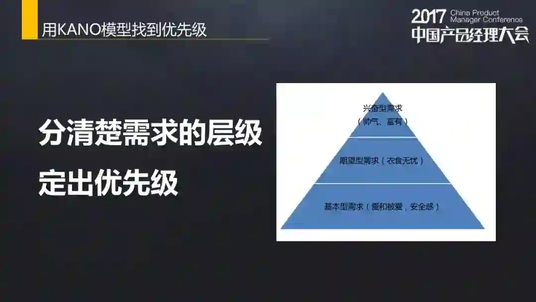 这是有名的金字塔需求模型,最底下一层叫基础型需求,中间一层是期望型需求,最上面一层是兴奋型需求。