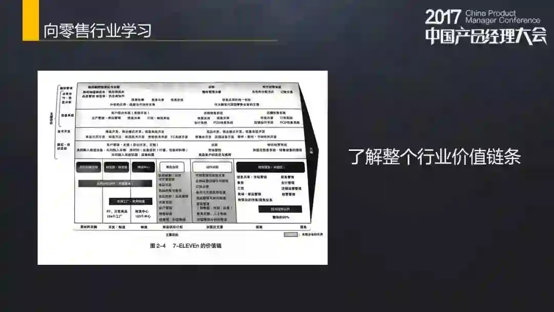 上面这张图是我从书上看到的7-11价值链图,讲有关制造型零售里的内容,我看了之后很震撼:我们以为很高级的东西,原来人家几十年前就在做了,而且还做得非常优秀、非常细: