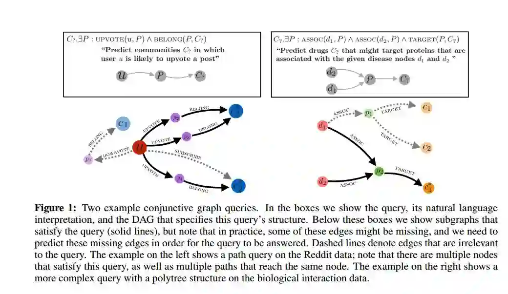 摘要:可以将知识图谱当做一张图,学习实体低纬度embedding,并将其应用于预测实体之间未观察到的或缺失的边。然而,这一领域的一个具有挑战性的问题是如何超越简单的边缘预测,处理更复杂的逻辑查询,这可能涉及多个未观察到的边、实体和变量。例如,给定一个不完整的生物知识图谱,我们可能想预测哪些药物可能靶向与X和Y疾病相关的蛋白质?这是一个需要对所有可能与X和Y疾病相互作用的蛋白质进行推理的查询(Query)。在这里,本文引入了一个框架,以便在不完整的知识图谱上有效地对连接逻辑查询(一阶逻辑f(first-order logic)的一个灵活但易处理的子集)进行预测。在本文的方法中,本文在低维空间中对图形节点embedding,并在这个embedding space中将逻辑运算符表示为学习过的几何运算(例如平移、旋转)。通过在低维embedding space中执行逻辑运算,与基于简单枚举的方法所需的指数复杂性相比,本文的方法实现了线性时间复杂性的变量查询。本文展示了这一框架在对现实世界数据集的两项应用研究中的结果,这两项研究涉及数百万种关系:预测药物-基因-疾病相互作用网络中的逻辑关系,以及来自流行网络论坛的基于图表的社会相互作用表示。