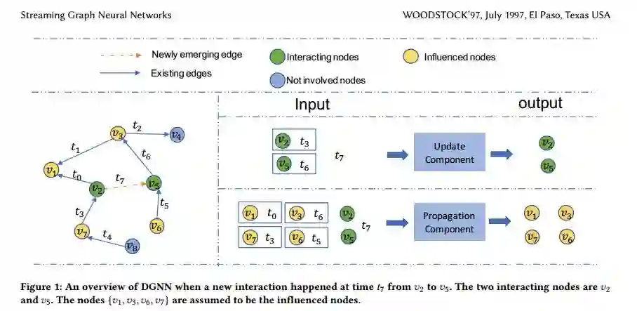 摘要:图是许多真实世界数据的基本表示,如社交网络。近年来,人们越来越努力将神经网络模型扩展到图形结构数据。这些通常被称为图神经网络的方法已经被用于推进许多与图形相关的任务,例如物理系统的推理动力学、图形分类和节点分类。大多数现有的图神经网络模型都是为静态图形设计的,而许多真实世界的图形本身就是动态的。例如,随着新用户的加入和新关系的建立,社交网络自然会不断发展。目前的图神经网络模型不能利用动态图形中的动态信息。然而,动态信息已经被证明可以提高许多图形分析任务的性能,例如社区检测和链接预测。因此,有必要为动态图设计专用的图神经网络。在这篇论文中,本文提出了一种新的动态图神经网络模型(Dynamic Graph Neural Network model)DGNN,它可以随着图的发展来模拟动态信息。特别地,所提出的框架可以通过捕获edge的顺序信息(交互)、edge之间的时间间隔和信息的连贯传播来保持更新节点信息。对各种动态图的实验结果表明了所提出框架的有效性。