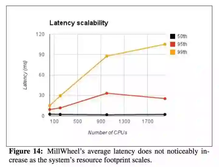 当然,并不是每一个广告的点击都会被送到系统里面:在获取 key 的时候我们也会获取这一行数据的时间戳,这个时间戳会被用来计算 low watermark。low watermark 的定义是现在已经到达 MillWheel 但是还没有被处理的数据的时间戳,但是这个时间戳不会超过一个用户定义的上线、不能比当下的时间晚太多。所以只要超过用户定义的时间的时间范围的数据,就是迟到的数据,迟到的数据的状态是不会被存到内存里面的。这个设计的厉害之处在于,如果数据处理一直很快,且所有的消息都没有迟到,那么 low watermark 会很接近现实的时间。如果数据出现迟到,再迟也不会超越用户设定的上限。