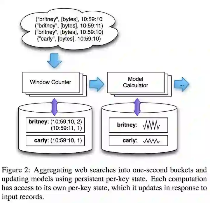 在提供一个 key 之后,MillWheel 还会提供一个 per key persistent storage,让你来更好处理你的业务逻辑。比如我需要给广告主提供的是每个广告每五分钟多少次点击,但是用户我不想每一个用户都存那么多东西,那可能每一个用户的点击我只要存 hyperloglog 就可以了,只要看他最近有没有很多点击来判断他是不是机器人,这个点击是否有效。