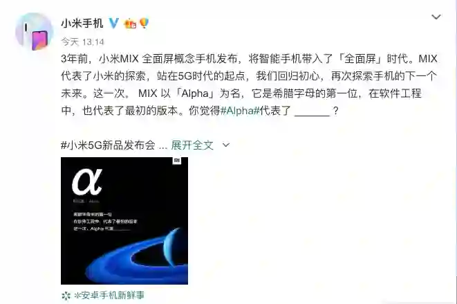 9月20日消息,小米手机通过官方微博宣布新手机名称为小米MIX Alpha。小米手机表示,MIX代表了小米的探索,站在5G时代的起点,回归初心,MIX 以「Alpha」为名,它是希腊字母的第一位,在软件工程中,也代表了最初的版本。