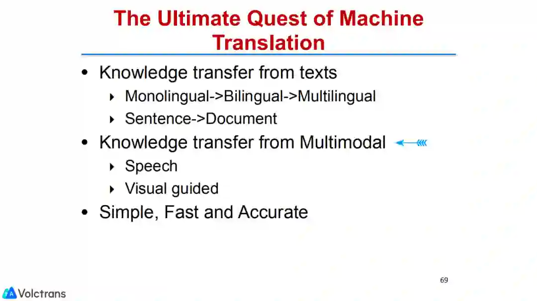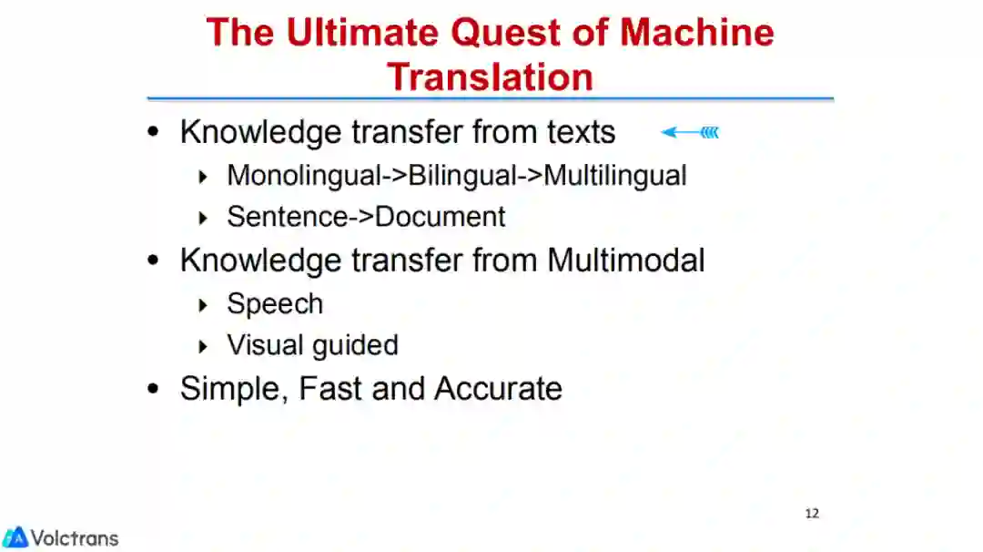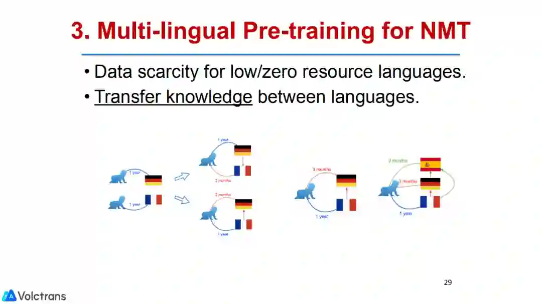 我们也在考虑通过多模态的方式获得信息,包括语音信号或者visual信号。人类理解世界是通过对语音、视频等信号进行感知,并且我们也不是生活在一个纯文本的世界里。所以首先和大家分享下我们在pre-training的一些工作,因为做知识迁移,最容易想到的思路就是预训练,由于双语资源是受限的,如何利用几乎无穷的多语言信息,或者其他的一些multilingual的信息,都是值得考虑的点。