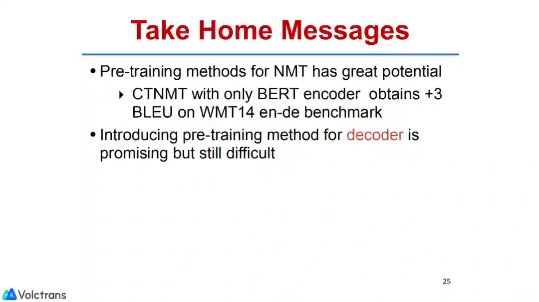 pre train finetuning模式对于机器翻译来说是非常有潜力的。我们简单地用bert做encoder,就可以在MT的benchmark上取得3个blue的提升,是一个非常显著的效果。