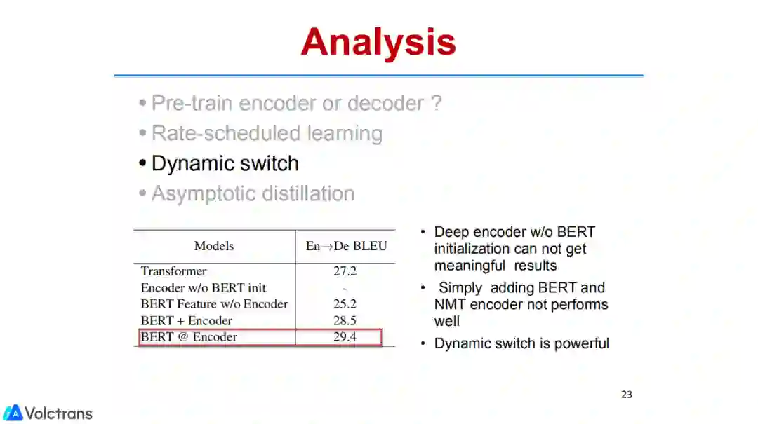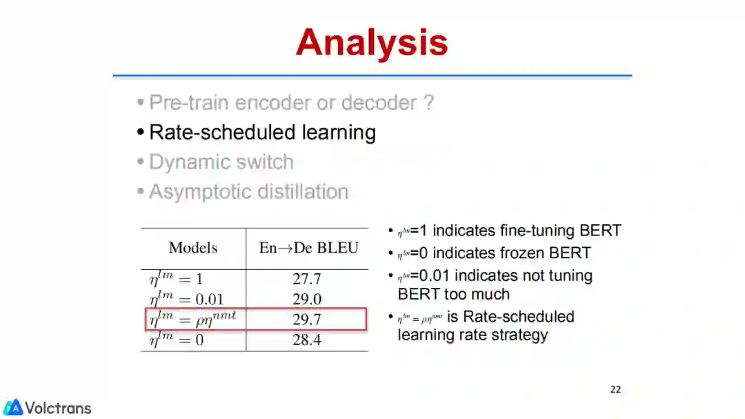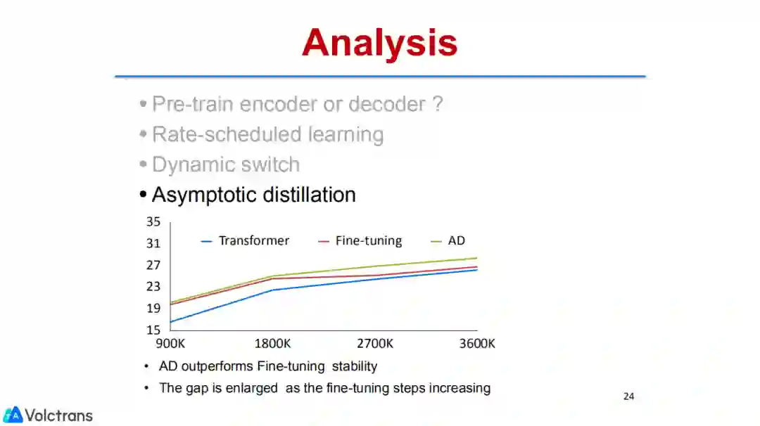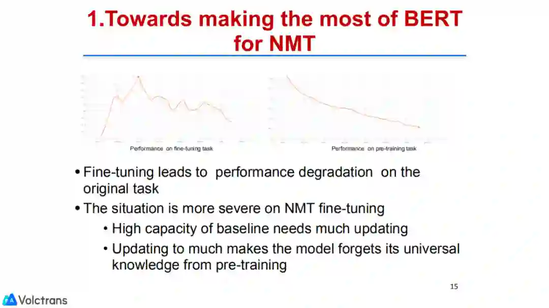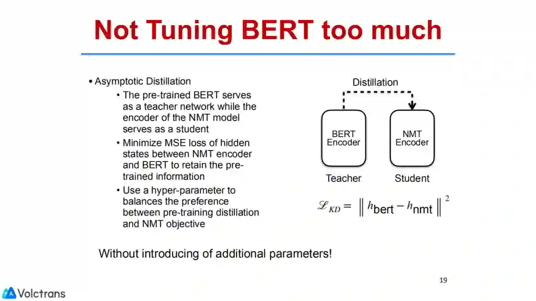 Asymptotic Distillation:其实也是做life long learning或者continue learning常见的一个方法,即KD。我们在整个更新的过程中依然保留encoder,让它去KD bert的knowledge,在做翻译loss的同时依然要去做bert的loss,两个loss同时进行,也会尽可能多地保留pre train的knowledge。