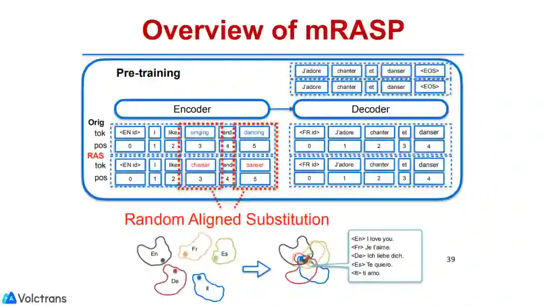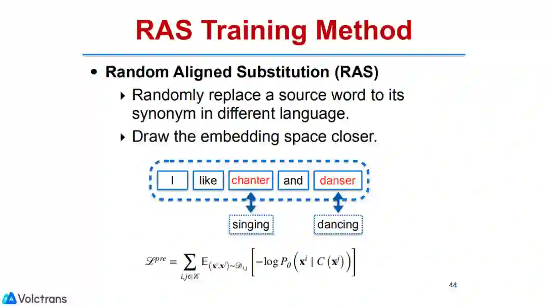 比如说在英语句子I like singing中,把singing这个词替换成法语的词,因为singing和chanter这两个词上下文一致,虽然是跨语言的,它也会得到一个同样的表示。