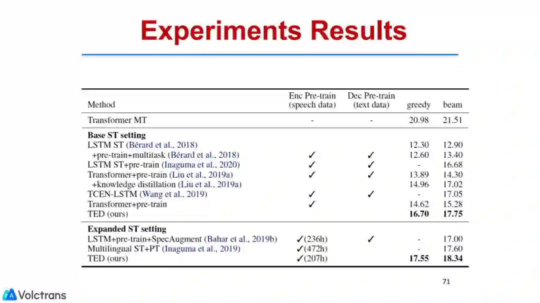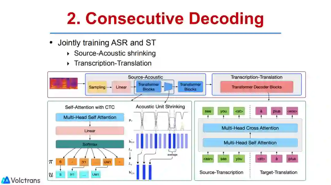我们也做了一些相关的decoder,把MT pretrain model(text pretrain)放到语音翻译里面。我们也做了consecutive decoder,把目标端的模型解耦,解耦成ASR和ST两个model,但也是端到端的,和上一个工作比较互补,能把MT数据用上。上一个工作是把ASR和单语数据用上。经过这两个工作,我们就可以把单语数据、ASR数据、MT数据用到端到端语音翻译中,能够很好的提升模型性能,并且有潜力达到可用状态,在多个数据集上都取得了SOTA的结果。
