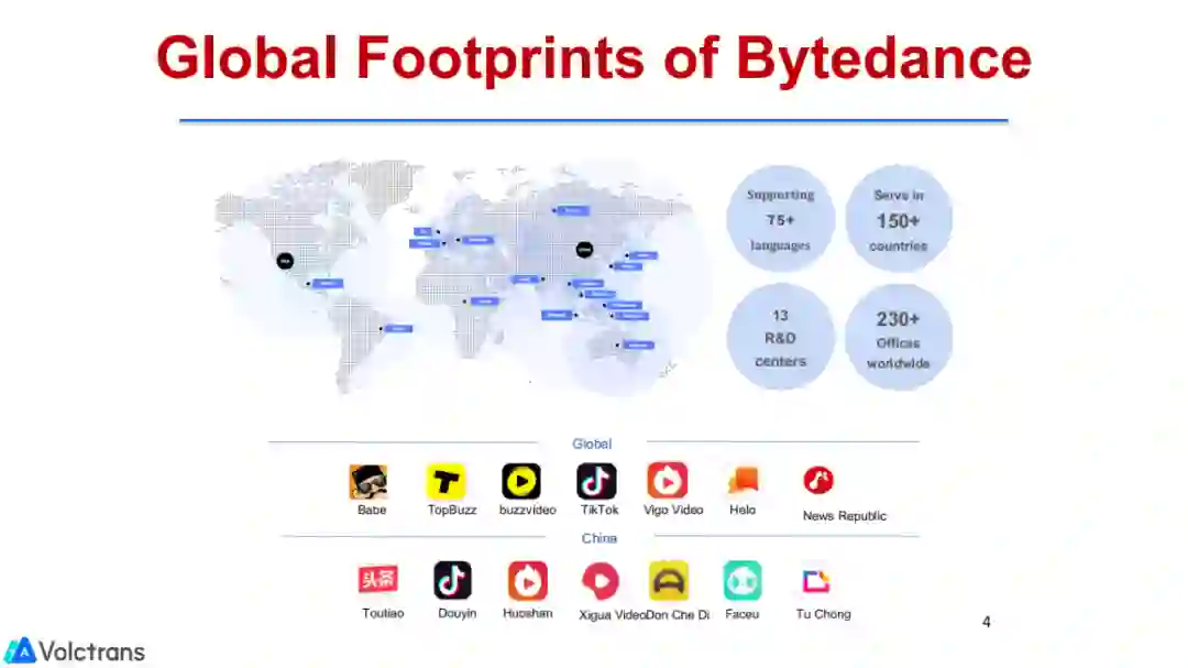 字节跳动诞生伊始就以国际化为目标,从我们的名字上就可以看出,字节跳动先有的英文名Bytedance,然后才定了中文名字节跳动。所以字节在建立之初就很重视做全球化的产品。目前字节在全球化方面,相对来说,都比较成功。比如TikTok,在全球上百个国家和地区都有用户,并且占据绝大多数国家的应用排行榜榜首。
