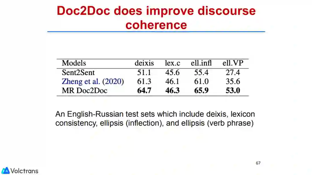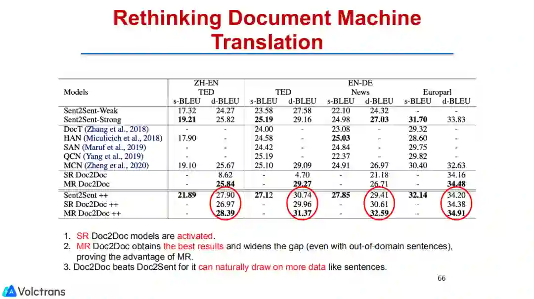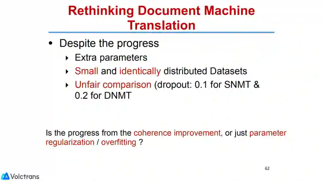 在这个过程中,我们非常想利用大量的数据,因为在绝大多数的MT实验中,大家用到的数据可能都比较有限,可能都是千万级别的平行数据,因为机器翻译对数据的要求是比较严格的。所以我们思考能不能通过半监督或者pre-training的方式构建一种模型,能够不只利用sentence level的数据,还可以利用包括document在内的一切数据,把所有可用的数据都利用上。