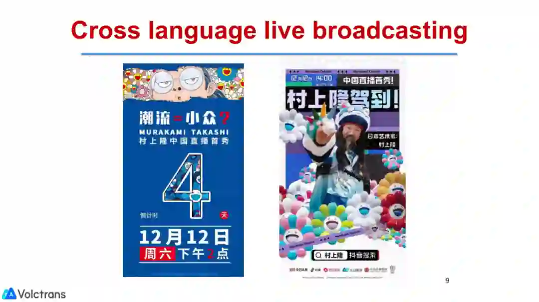 另外我们也做视频直播。前一段时间刚刚做了一个村上隆的直播,他是海外的一个艺术家。抖音未来会越来越多地邀请其他国家的一些名人来国内做直播,或者邀请他们做跨国直播,这个过程中可能需要通过机器翻译来解决这种语言障碍。