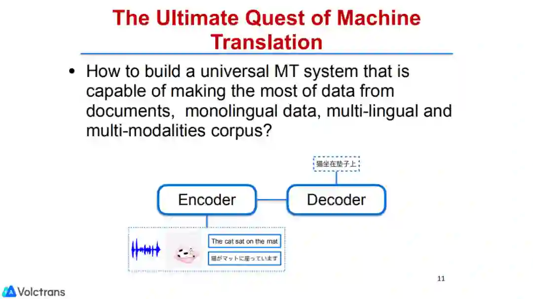 目前的翻译还都是基于文本的,我们的目标是做一个通用的MT system,源端做一个跨模态的编码,可以非常好的利用各种类型的数据,包括语音数据、单语数据、文档数据、多语言数据和多模态的数据,对这些数据进行理解,用目标端生成文字。