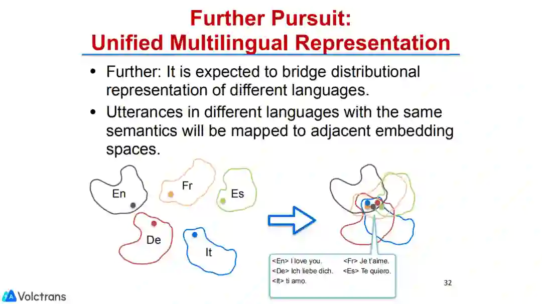 我们的出发点是希望找到多语言之间universal 的 representation。不同的语言,如英、法、意、德、西,都可以被表示在同一个空间里,不同的句子虽然有不同的字符,但它们的hidden state都是一样的。