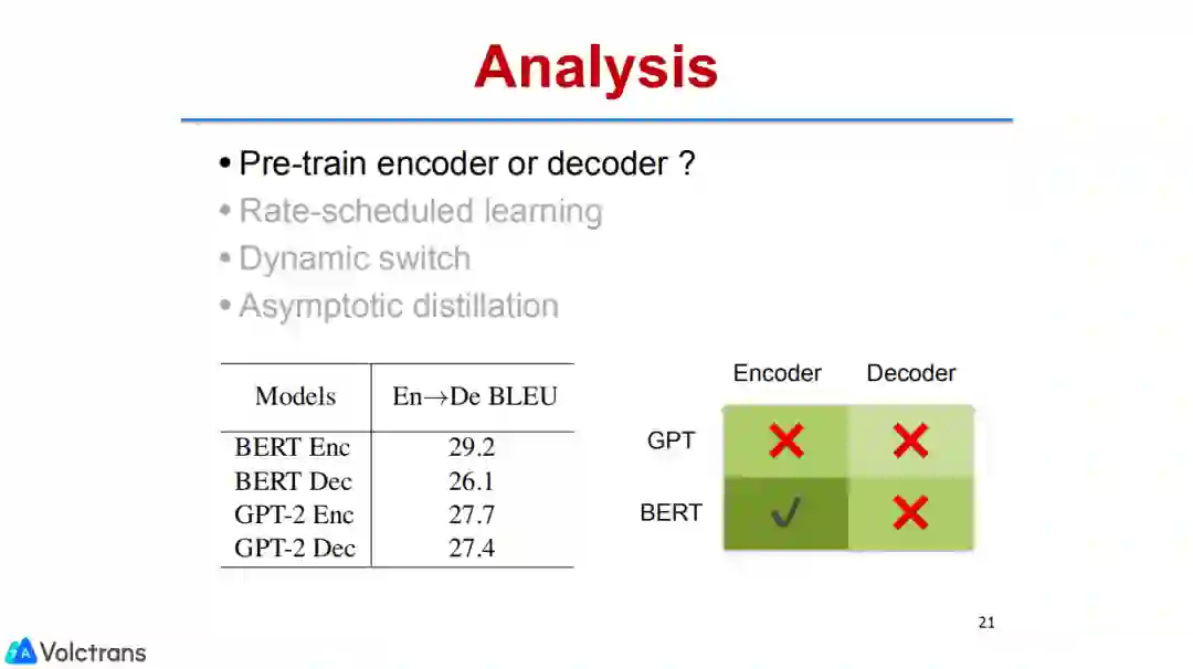 我们发现decoder pre train目前还没达到一个理想的状态,这是因为结构不一致。GPT是一个语言模型,但翻译是一个conditional language generation模型,所以这两个目标不一致会导致decoder用GPT pre train还没有那么有效,这也是一个非常有潜力、值得探索的方向。
