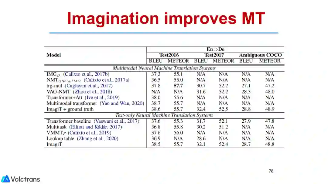 这个效果也是非常好的。整个模型结构这里就不展开了,简单说就是先通过文本生成图像信息,再把文本和图像一起编码,最后去做翻译。最后的结果还是非常不错的,我们在没有输入图像的情况下就能够和其他的一些多模态的有图像输入的模型达到相当或几乎一样的效果。