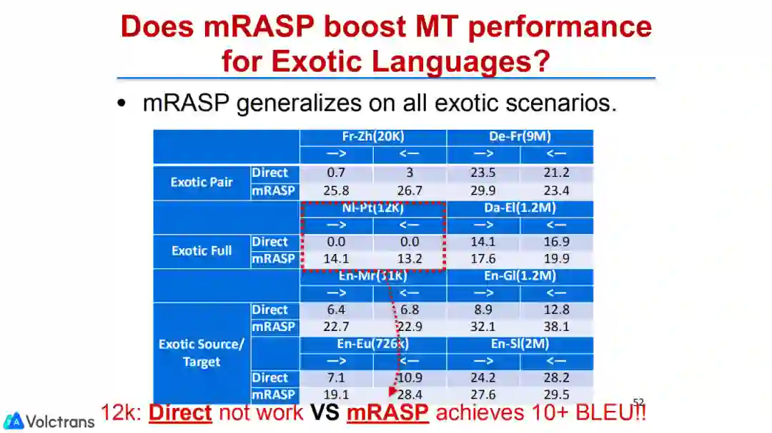 我们的model在rich resource的英法语言对的benchmark上,也能取得1.1个BLEU的显著提升,达到了一个比较SOTA的结果。另外,在从来没有见过的语言对上也能有一个非常显著的提升,特别是在Nl-PT这种只有12000句训练数据、平行数据非常少的情况下也能够取得10个BLEU的显著提升。