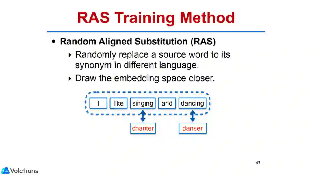 更具体的,在这个过程中我们也提出了随机替换策略,对源端的每一个句子中的词都进行一些替换。