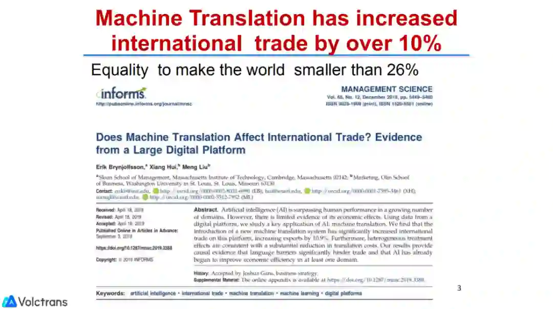 最近有一项社会学研究称,在过去的几年中,机器翻译让国际贸易增加了10%,并且让整个世界变小了26%。这是一个非常实际的影响,AI技术真正的在改变世界。