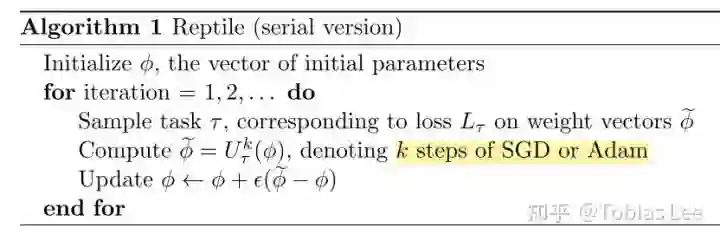 当然,也有研究者认为这样的二阶导数计算复杂,所以也提出了 REPTILE,一个一阶的 Meta-Learning 算法,框架如下: