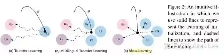 Meta-Learning for Low-Resource Neural Machine Translation: EMNLP 2018 的文章,是 Meta-Learning 在 NMT 上的一次尝试,思路也很直接,机器翻译任务中存在着大量的语言,他们的语料因为使用范围、人数等原因本身就少,规模不大。那么,能不能利用富语料 e.g. En-De / Ch-En 做预训练,从而快速地 fit 小语料的翻译任务呢?套用 MAML 的框架,如果我们把每一个语言对视作是一种 task,那么只有少量数据的语言对的翻译就是 MAML 对应的 k-shot learning 问题,文章也给出了一个很直观的示意图: