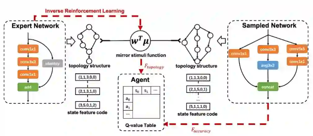 IRLAS的作者观察发现:人们自行设计的网络拓扑结构往往比自动化生成的那些结构更优雅,而这些结构同时定义着网络的响应时间和内存消耗。因此,作者没有显式地设定资源消耗的约束,而是试图促使生成的网络拓扑尽可能地模仿某种经典网络模型(如ResNet)。“模仿”这一部分是通过一个奖励函数中的一个附加项来实现的。