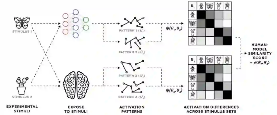 为了定义HMS,作者建立了一种“表示性不相似程度矩阵”(RDM,representational dissimilarity matrix)来量化两个系统(这里是网络与人脑)对一对刺激的响应。给定两个RDM,HMS被定义为二者的斯皮尔曼等级相关系数。