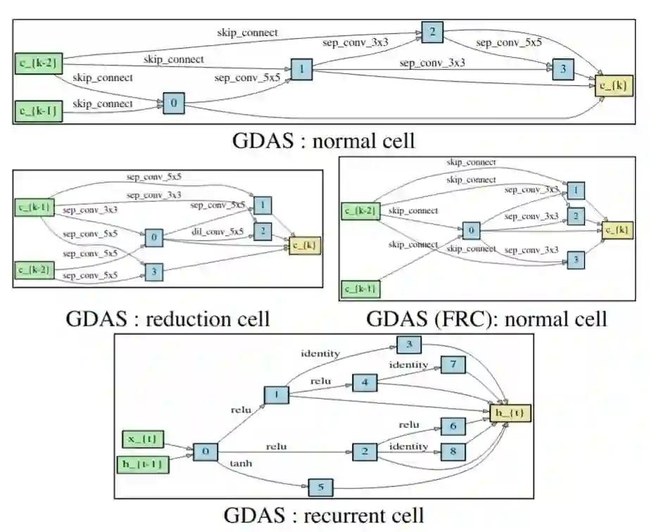 这篇论文中,作者结合了ENAS和DARTS二者的最佳实践,从而提出了GDAS(Gradient-based search using Differentiable Architecture Sampler)方法。DARTS的定义上文已经提到;ENAS是Pham et. al提出的一种基于强化学习的神经架构搜索方法,它在一开始同样初始化了一个巨大的图——但与DARTS在每个边上添加权重的方式不同,ENAS使用基于强化学习的控制器来决定选择哪一条路径。