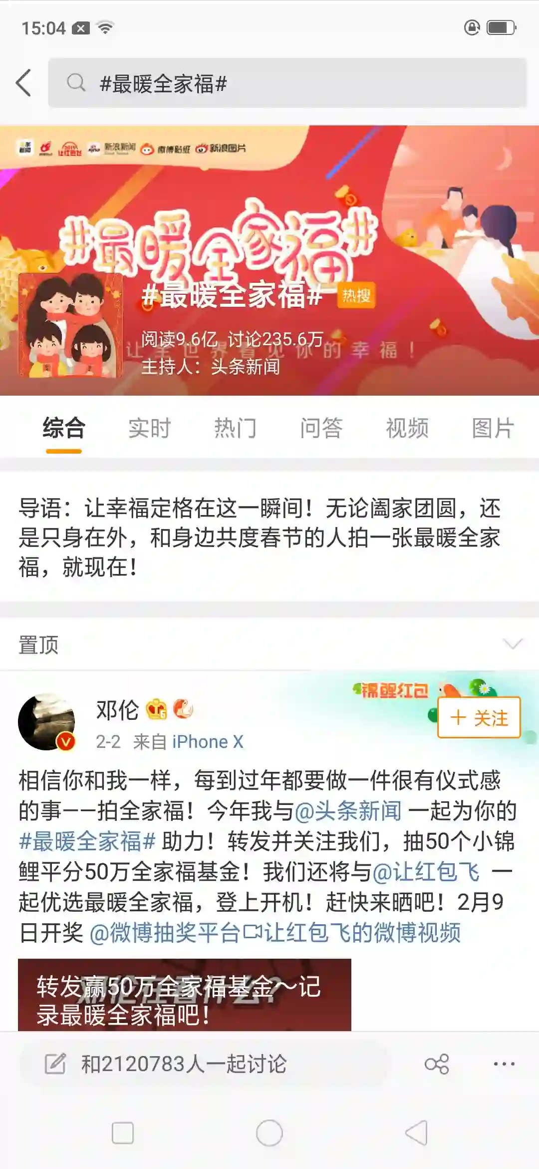 比如,各类春节相关话题也受到网友的积极参与,网友们纷纷用手机纪录分享春节故事,通过文字、镜像定格幸福温暖瞬间。截止目前,#最暖全家福#话题阅读量达到9.6亿,讨论超230万。#春节摄影大赛#阅读达到50亿,讨论量超过409万。