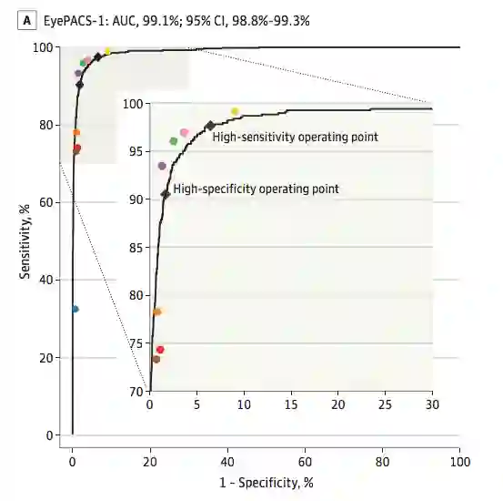 深度学习之所以比医生更有优势,是因为它们可以在各个“操作点”上运作,相同的系统可以执行高灵敏度筛选和高特异性诊断,不需要再加额外的训练。