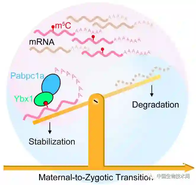 研究团队首次绘制了斑马鱼早期胚胎发育过程中RNA m5C甲基化图谱。 测序分析发现,在母源-合子转换过程中,m5C修饰的母源mRNA比未修饰的mRNA更稳定。 利用Oligo-pulldown结合质谱技术发现了斑马鱼中新的m5C结合蛋白Ybx1。 进一步通过ITC、蛋白解构技术等发现了Ybx1倾向于通过其CSD结构域关键残基Trp45与m5C的π-π相互作用,识别m5C修饰的mRNA。 功能实验表明,ybx1缺失导致早期胚胎发育阻滞在囊胚期和原肠期。 通过免疫共沉淀、GST-pulldown技术和高通量测序技术,鉴定了poly(A)结合蛋白Pabpc1a为Ybx1的互作蛋白,发现pabpc1a缺失的胚胎表现出与ybx1缺失胚胎相似的表型且Ybx1靶向结合的mRNA的稳定性显著降低。 最后,利用单基因报告系统证明Ybx1和Pabpc1a以m5C依赖的方式维持母源mRNA的稳定性并最终促进斑马鱼早期胚胎发育进程。