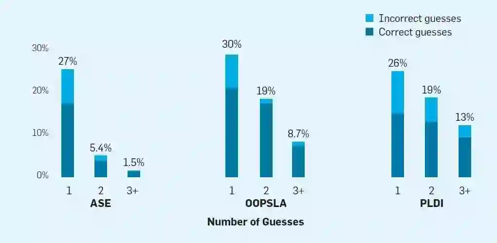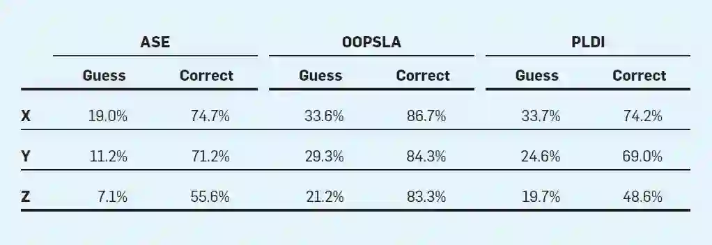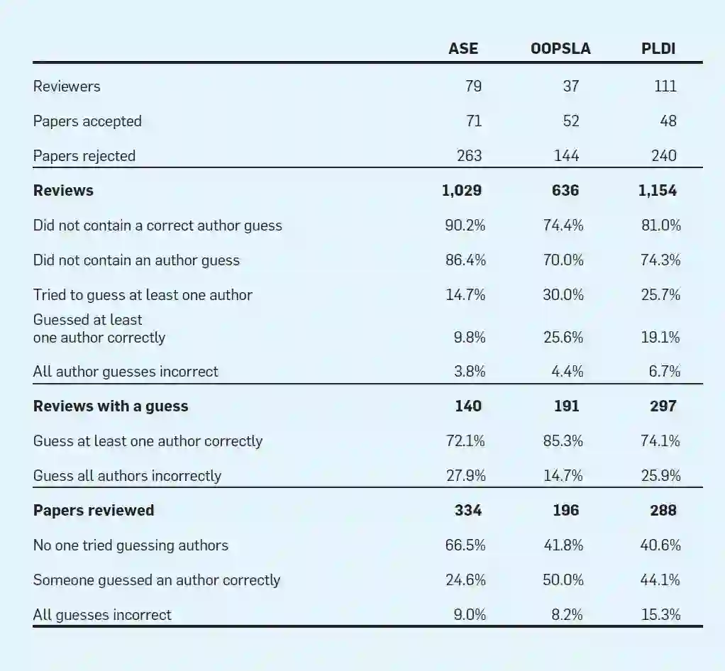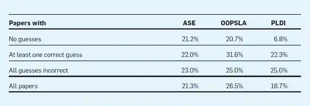 当评审者进行猜测的时候,他们很可能会猜对。其中,ASE 的猜测正确率是72%,OOPSLA是 85%,PLDI是74%。然而,大多数论文没有一个评审人猜对哪怕一个作者,而且大多数评审意见包含不正确的猜测(ASE 90%, OOPSLA 74%, PLDI 81%)。
