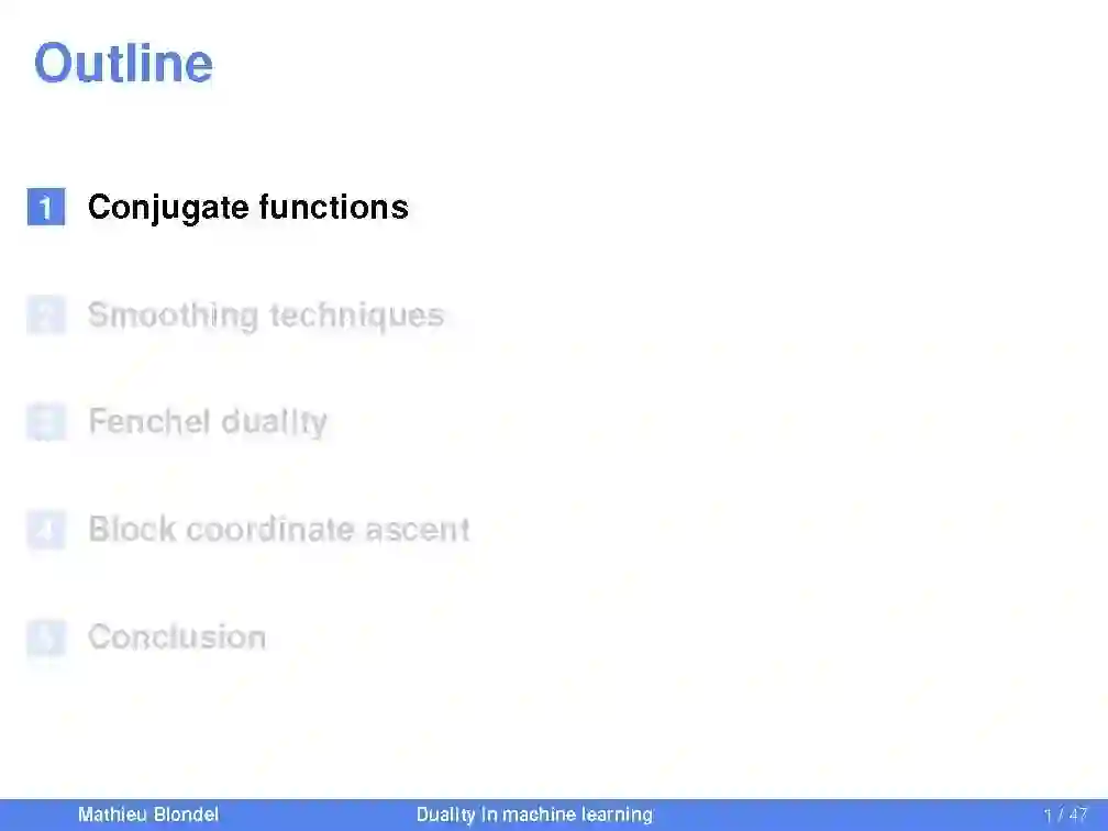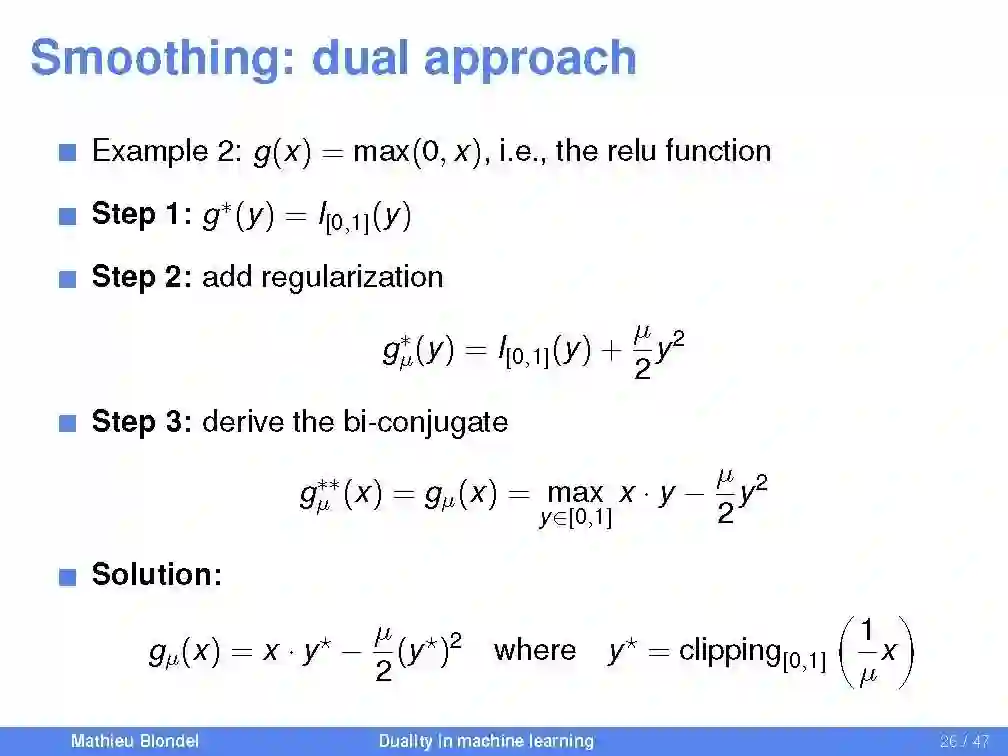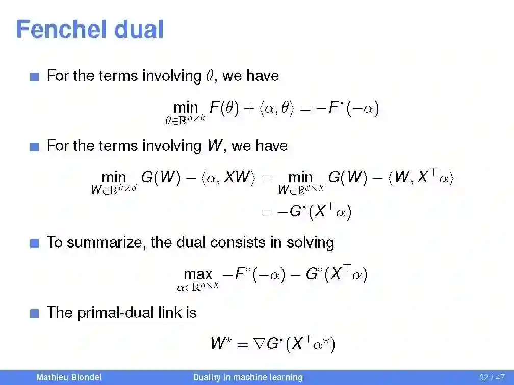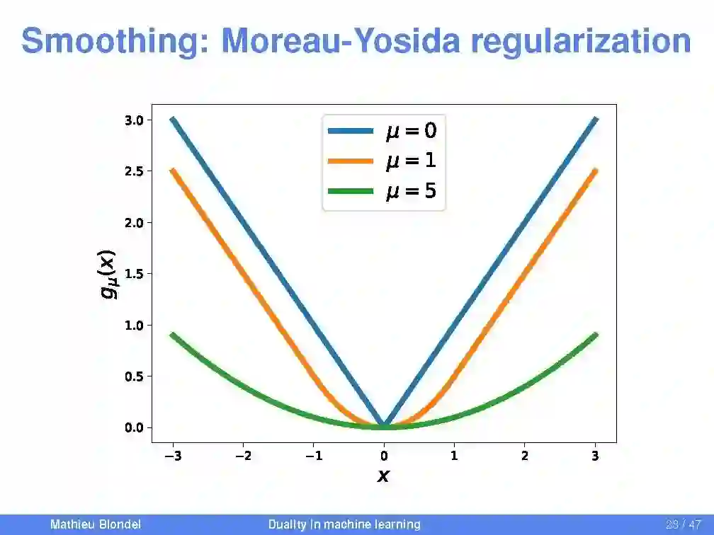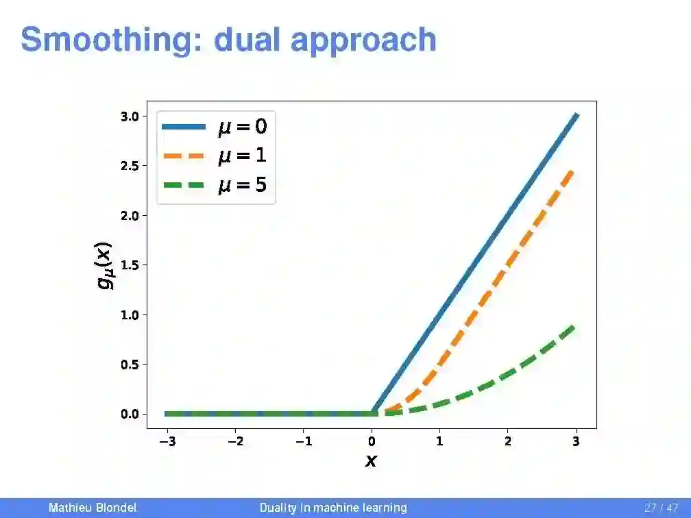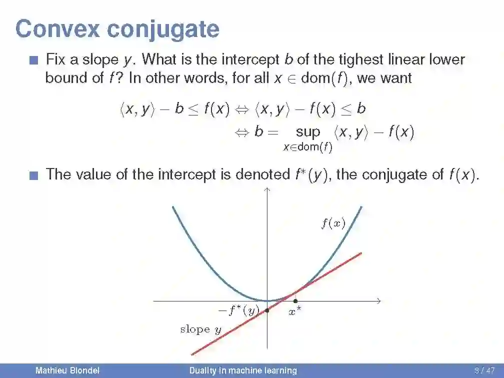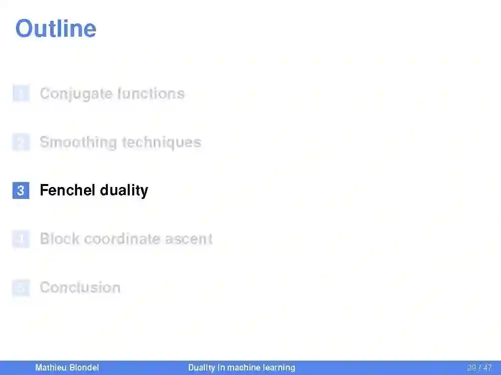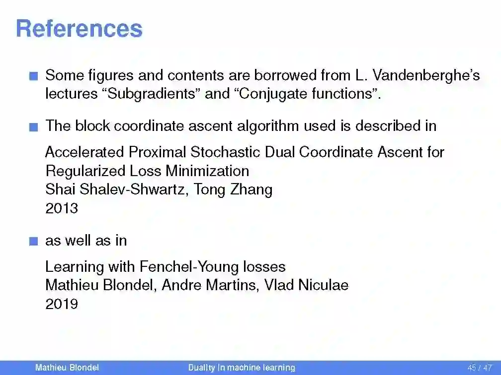 Google 研究科学家Mathieu Blondel在PSL大学的“机器学习的对偶性”课程材料。主题包括共轭函数,平滑技术,Fenchel对偶性,Fenchel-Young损失和块对偶坐标上升算法。